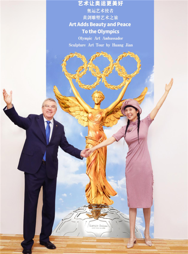 巴赫对黄剑说:“你是一位了不起的雕塑艺术家,具有浪漫主义情怀,塑造了许多美丽、优雅的艺术形象,作品中蕴含了很多奥林匹克精神和理念,并将文化和艺术与奥运完美结合,是名副其实的‘奥运艺术使者’。希望能继续坚持用艺术为奥运插上和平与美好的翅膀,飞向世界各地。”