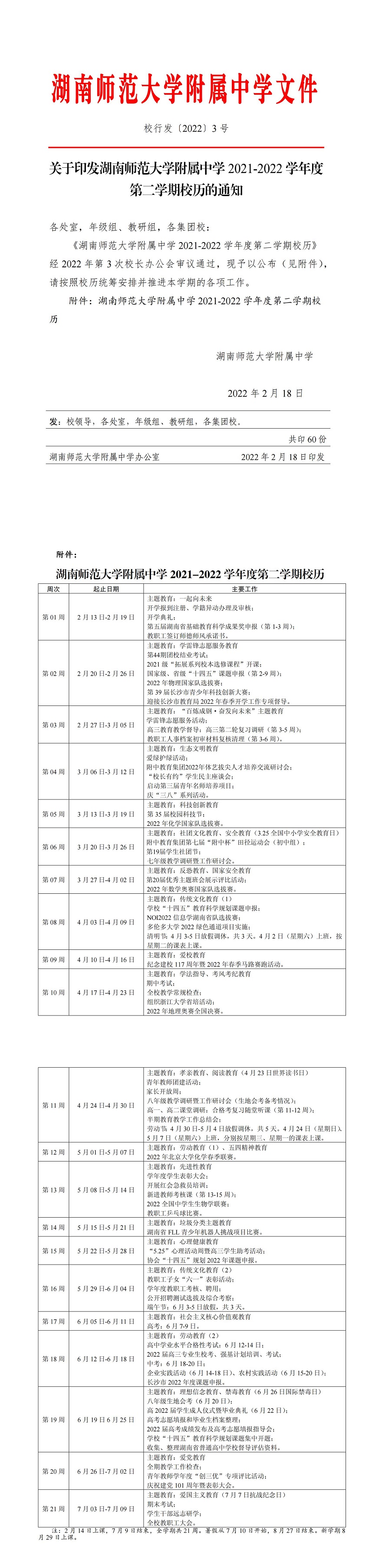 湖南师范大学附属中学2021-2022学年度第二学期校历