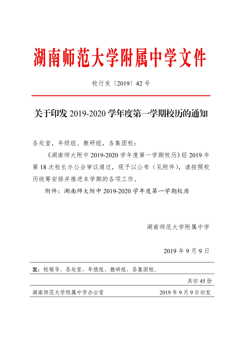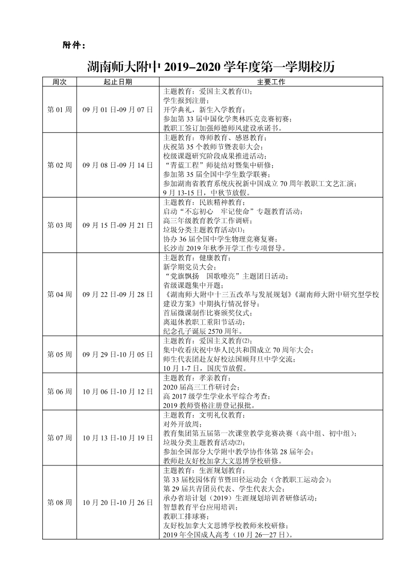 2019-2020学年度第一学期校历