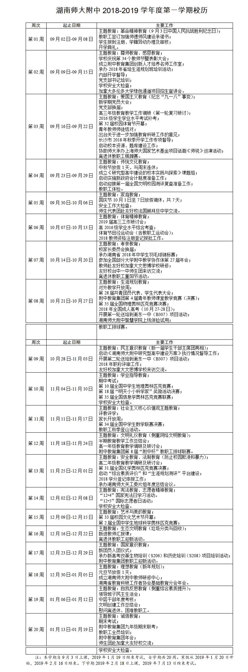湖南师大附中2018-2019学年度第一学期校历