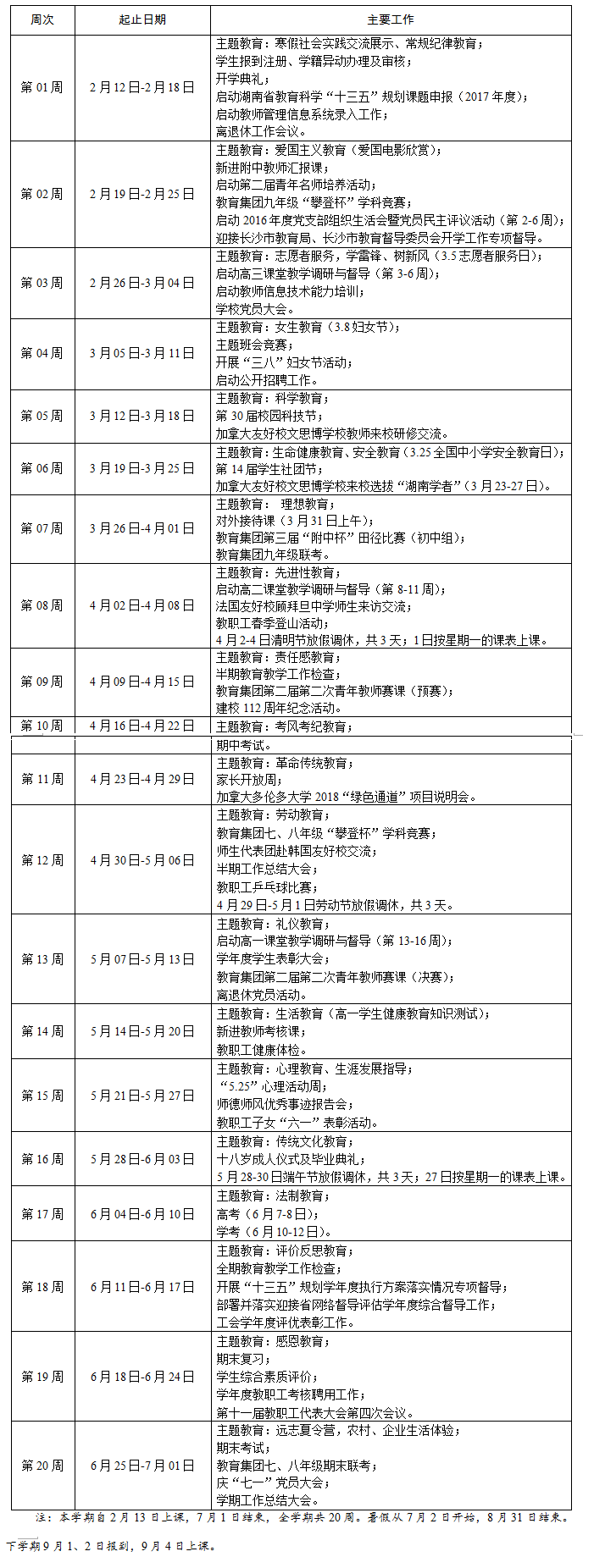 湖南师大附中2016-2017学年度第二学期校历