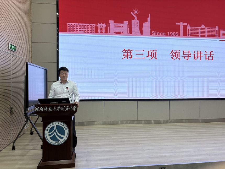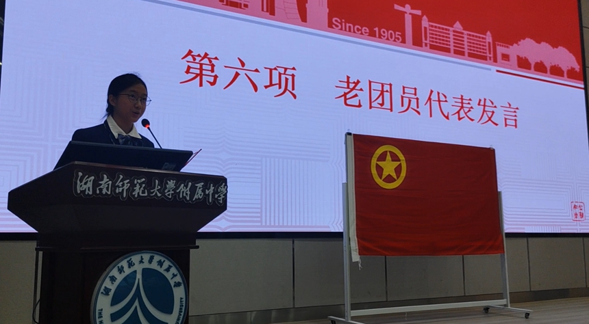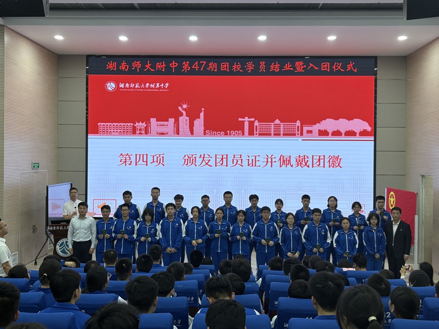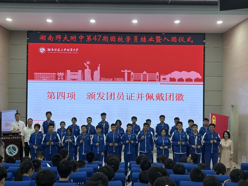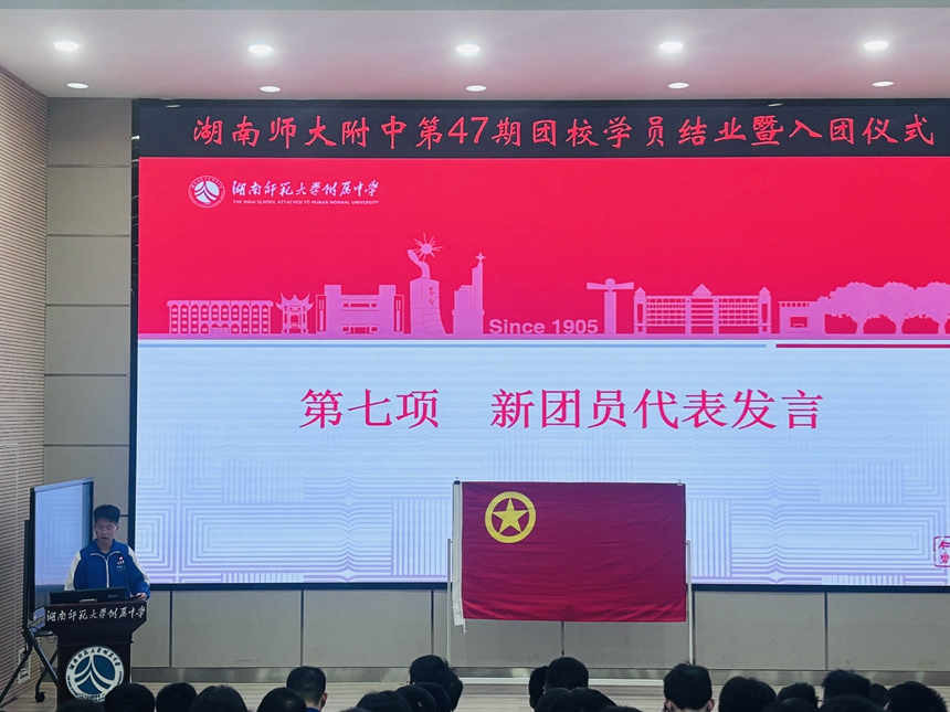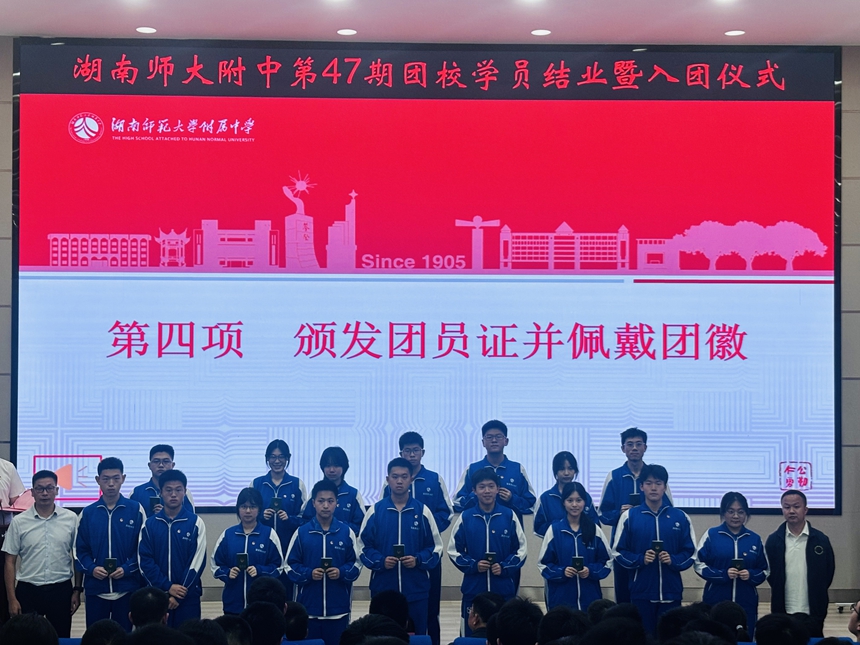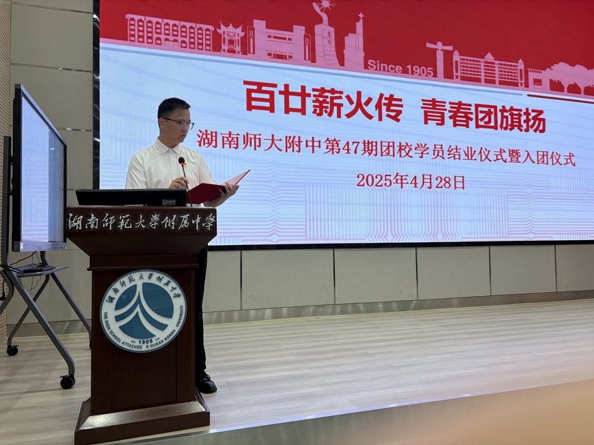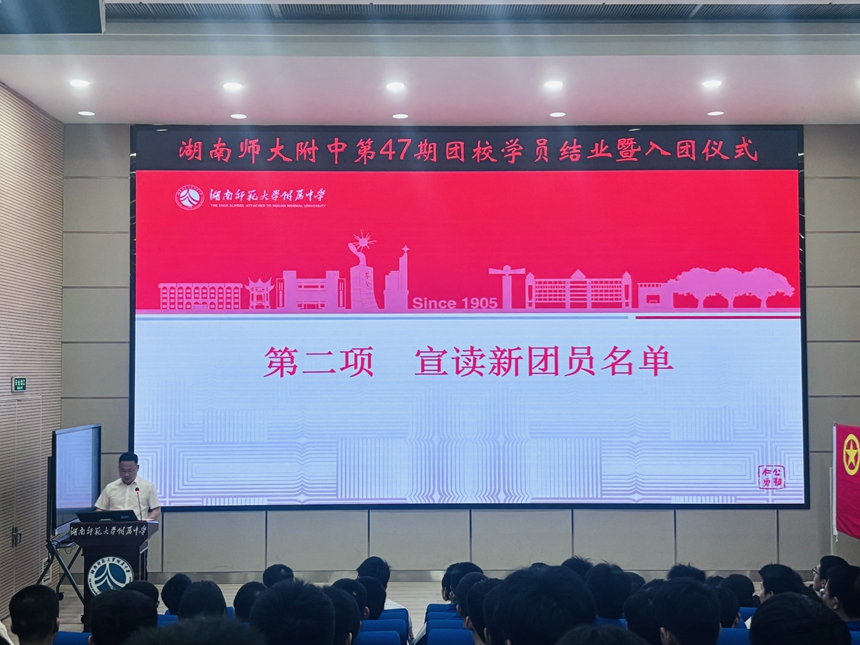 蔡毅宣读湖南师大附中2024 - 2025学年度新团员名单。依据《中国共产主义青年团章程》规定,经过长达五个月的系统学习与严格考核,通过支部大会表决和公示环节,本期团校共有265名学员考核合格,光荣加入中国共产主义青年团。