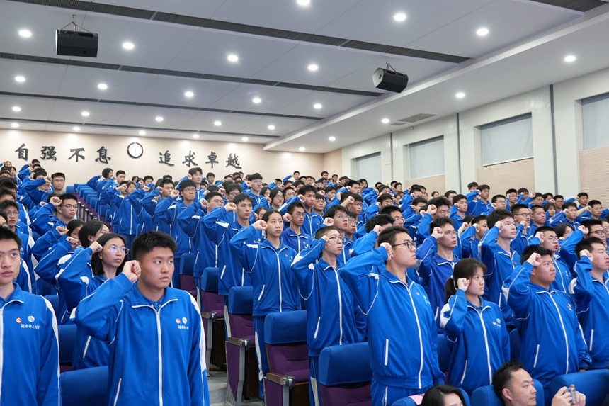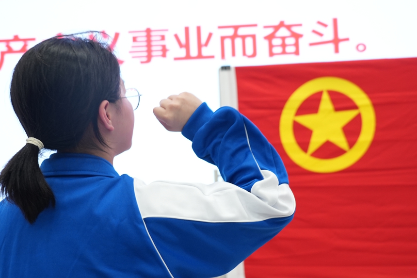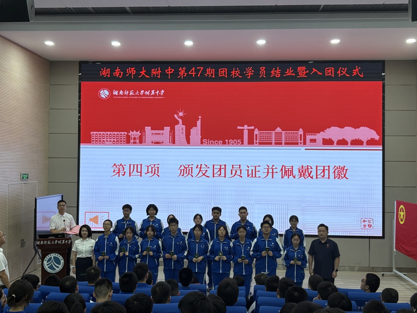 在热烈的掌声中,与会领导和老师为新团员颁发团员证、佩戴团徽。新团员代表李则瑾带领全体新团员面向团旗庄严宣誓,誓言铮铮,彰显着新团员们的坚定信念与责任担当。