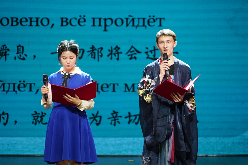 在颁奖仪式后,俄罗斯喀山市183中学的伊力汉与我校高一年级学生郭紫姝带来了“中俄诗歌串读”朗诵节目,共同朗诵了俄语诗歌《假如生活欺骗了你》。随后,伊力汉用中文朗诵了《沁园春·长沙》。全场气氛热烈,欢呼声此起彼伏,充分展现了中俄两校之间的深厚友谊。