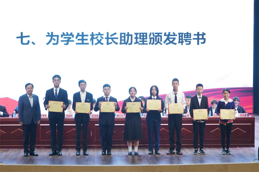 校长谢永红为学生校长助理颁发聘书,并嘱咐他们一定要做好学生与老师、与学校管理者之间的桥梁纽带,切实履行职责,服务学校发展,充分了解学生的所想、所需、所求,积极为持续推动学校高质量发展献计献策。