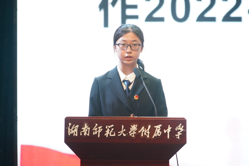 副校长廖强宣布新一届校级学生干部名单。2023-2024学年度校级干部在新一届团委学生副书记朱敏绮的带领下进行就职宣誓。他们表示将牢记“热情、自信、博学、共进”的校干精神,全心全意为师生服务,为打造卓越附中、和谐校园而努力奋斗。