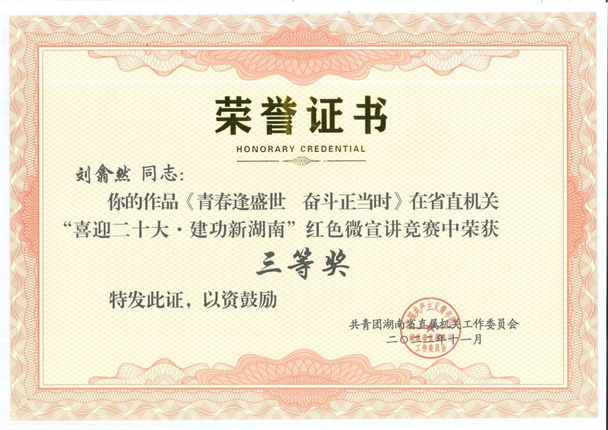 为迎接党的二十大、庆祝建团 100 周年,省直团工委举办了省直机关“喜迎二十大 ·建功新湖南”红 色微宣讲学习竞赛活动。我校各团组织和广大团员青年学生积极响应,围绕学习习近平新时代中国特色社会主义思想、党的百年奋斗重大成就和历史经验、新时代党和国家事业发展的伟大成就、党领导中国青年运动的光辉历程、贯彻落实党的十九届六中全会 和省十二次党代会精神、讲好新时代湖湘青年奋斗故事等,广泛 开展微宣讲活动,引导团员青年学生坚定跟党走,奋进新征程,为党的二十大胜利召开营造了良好氛围。我校刘翕然同学的作品《青春逢盛世 奋斗正当时》荣获省直机关“喜迎二十大 ·建功新湖南”红色微宣讲三等奖。