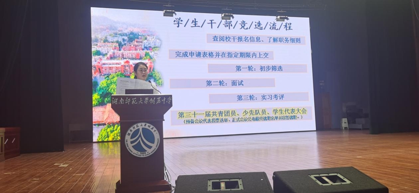 9月2日,为了让2021级新生尽快适应新的生活,培养集体意识、规则意识,号召有能力的新同学加入附中校级学生干部这个温暖的大家庭,我校开展了校级学生干部宣讲会,由德育与学生发展处副主任兼团委书记李钊主持,校团委学生副书记徐雨晨和学生会主席田雅担任主讲嘉宾。
