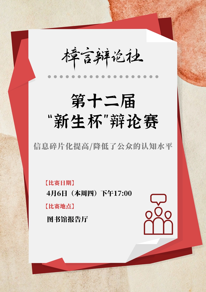此次辩题旨在加深同学们对于信息碎片化的了解,引发同学们在信息碎片化浪潮中对于获取信息方式的反思。十二年来,“新生杯”辩论赛,不仅锻炼了新生的辩论能力和合作能力,提高了同学们的思维反应速度、沟通能力,还增强了同学们语言组织能力和应变能力。