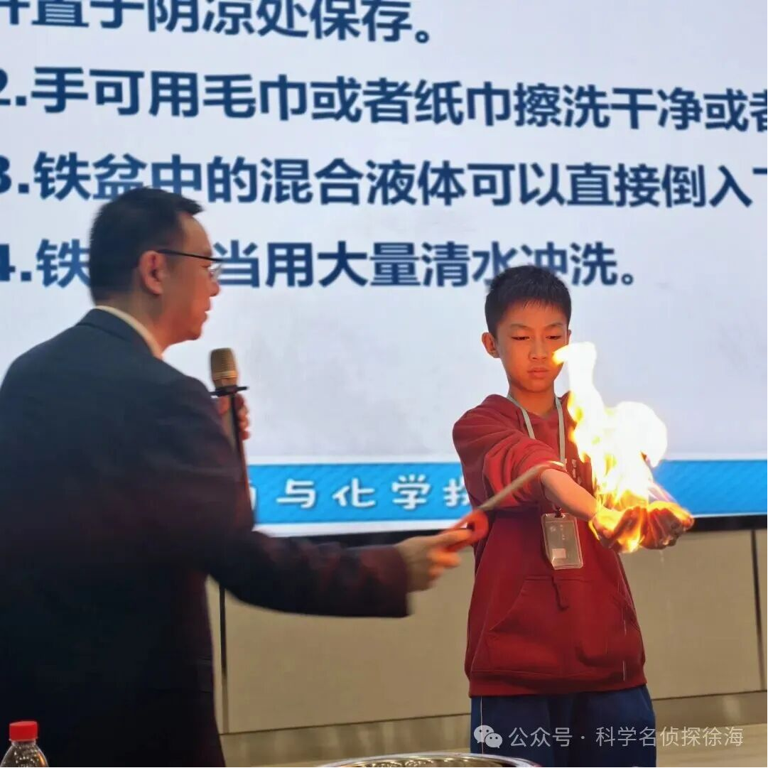 互动实践环节成为讲座高潮。在徐海教授的专业指导与安全防护下,学生分组参与“火焰掌”等经典科普实验。当学生小心翼翼托起充满丁烷气的泡沫并点燃,蓝色火焰在掌心短暂绽放却未伤分毫,现场响起阵阵惊叹。“丁烷燃烧速度极快,泡沫中的水分能迅速降温形成安全防护层,这就是科学控制下的‘魔法’。”徐海教授同步拆解原理,全程强调安全规范与科学严谨性,要求学生仔细观察、深入思考。“亲手做实验比单纯听课更有收获,既体验到科学的神奇,又学到了实用知识。”参与学生难掩兴奋。