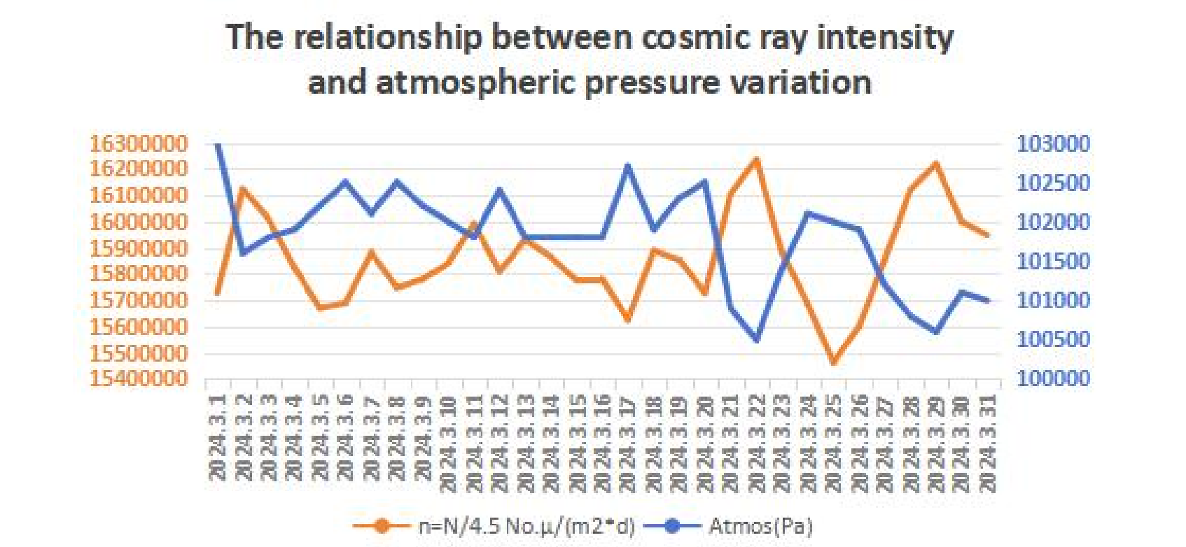 This study is based on data collected in March 2024 by a cosmic ray detector array installed at Beijing Dongzhimen Middle School (latitude 39.933°N, longitude 116.417°E, elevation 46.4 meters). The relationship between cosmic ray intensity and atmospheric pressure was analyzed using local atmospheric pressure observations. The array consists of nine plastic scintillator detectors arranged in a 3×3 matrix, with a spacing of 10 meters between detectors. Each detector has a sensitive area of 0.5 square meters. When charged particles, such as muons, pass through the scintillator, they excite fluorescence, which is then converted into electrical signals via photomultiplier tubes. Due to the strong penetrating ability of muons, the experiment was designed to record a valid cosmic ray event only when all detector units generated signals simultaneously within a specific time window, effectively excluding noise interference. Based on 31 consecutive days of observational data from March, we statistically analyzed the local atmospheric pressure and the daily muon count (Figure 1) and plotted the relationship between cosmic ray intensity and atmospheric pressure (Figure 2). The results show that as atmospheric pressure increases, cosmic ray intensity gradually decreases. This phenomenon can be explained by the atmospheric shielding effect: higher pressure corresponds to a greater equivalent atmospheric thickness, increasing the probability of cosmic rays being absorbed or scattered as they pass through the atmosphere. As a result, only higher-energy primary cosmic rays can reach the ground, leading to a reduction in detected cosmic ray intensity.