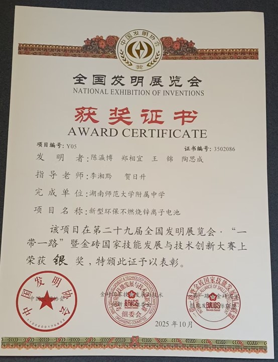 10月19日,2025年第二十九届全国发明展览会“一带一路”暨金砖国家技能发展与技术创新大赛在河北省石家庄市国际会展中心圆满落幕。我校陈瀛博同学主持的科创项目《新型环保不燃烧锌离子电池》凭借扎实的专业功底和突出的创新能力脱颖而出,最终荣获银奖,为学校赢得了国际声誉。