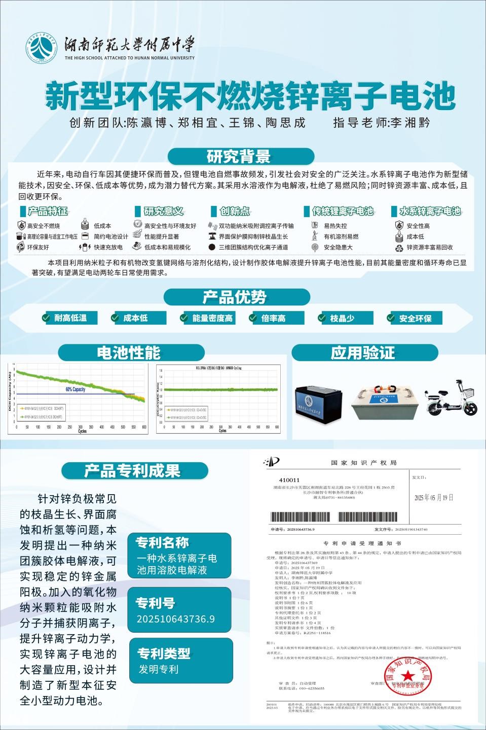 该项目的主要特征:锌离子电池安全性高,不起火、不爆炸,水系电解液绿色环保,符合目前电动自行车发展要求。锌离子电池循环寿命长且具有快充快放能力,绿色环保且成本低廉。与锂离子电池相比,安全性高且成本低廉;与铅酸电池相比,绿色环保。本产品使用电解液添加剂作为分散介质,稳定纳米氧化铝颗粒均匀分散,并且破坏水分子间的氢键网络,降低水的活性,有效延长锌离子电池使用寿命和快充快放能力。该成果于2025年5月成功申报专利。该项目指导教师为李湘黔、贺日升老师。