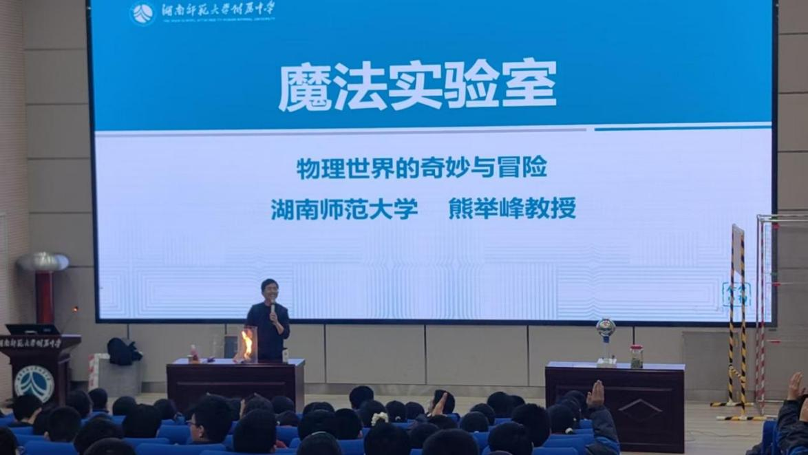 2月21日,湖南师大附中惟一大讲堂内掌声雷动,一场别开生面的“魔法实验室”主题讲座在这里精彩上演。本次活动特邀湖南师范大学物理与电子科学学院熊举峰教授担任主讲人,带领同学们开启了一段奇妙的科学探索之旅。讲座伊始,熊教授以有趣的“魔法”实验吸引了全场目光,包括火龙卷、孔明灯演示空气浮力、偏振片表演隐身术、起电机表演静电飞花、特斯拉线圈表演闪电、法拉第笼演示电磁屏蔽等,并通过深入浅出地讲解了这些“魔法”背后的科学原理,将复杂的物理知识以通俗易懂的方式呈现给同学们。在互动环节,同学们踊跃提问,熊教授耐心解答,现场气氛热烈。同学们纷纷表示,这场讲座不仅让他们感受到了科学的魅力,更激发了他们学习科学、探索科学的兴趣。