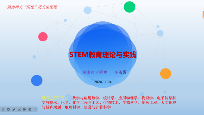 11月4日,我校李湘黔老师科学教育研究成果《STEM教育理论与实践》在湖南师大进行了推广。湖南师大国优计划研究生班化学化工学院、地理科学学院、数学与统计学院、物理与电子科学学院、生命科学学院、世承书院等学院共30位学生选修了该课程《STEM教育理论与实践》。该课程共32个课时,上课时间是下午2:30-下午6:00,上课地点:师大三棵树广场科研楼108教室 。教育部 2023年设立《关于深入推进实施国家优秀中小学教师培养计划的通知》(以下简称“国优计划”),支持“双一流”建设高校为代表的高水平高校选拔专业成绩优秀且乐教适教的学生作为“国优计划”研究生,在强化学科专业课程学习的同时,系统学习教师教育模块课程(含参加教育实践),重点为中小学培养一批研究生层次高素质科学类课程教师。