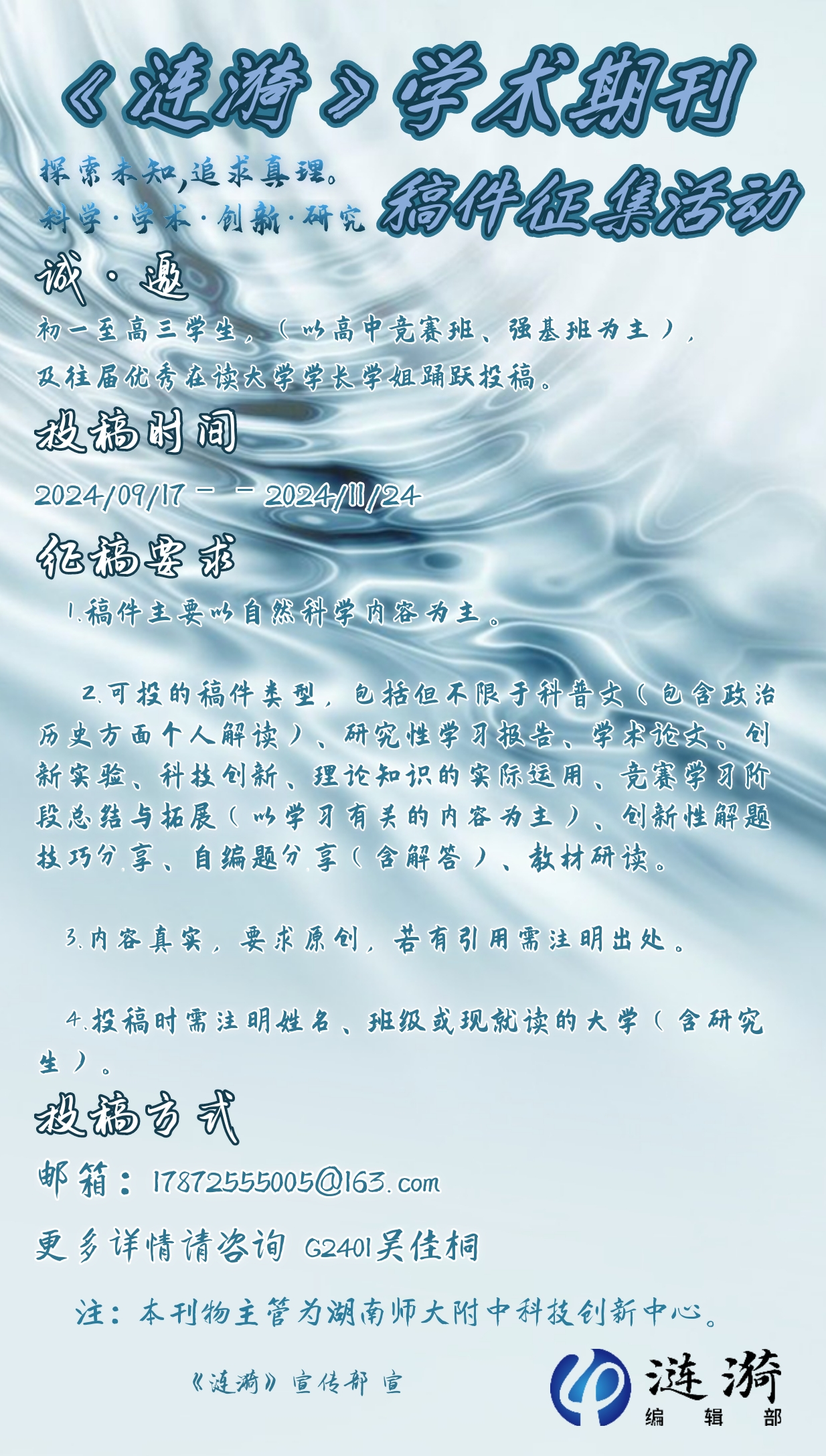 9月17日,湖南师大附中创办学生学术科学教育《涟漪》学术期刊,稿件主要以自然科学内容为主,文稿来自于学生(含优秀校友),不限于学术论文、研究性学习报告、创新实验、科技创新、理论知识的实际运用、科普文、竞赛学习阶段总结与拓展。期刊社长为G2401班吴佳桐同学,本刊物主管为湖南师大附中科技创新中心。