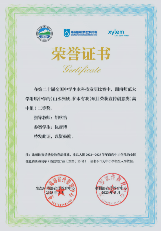 我校高二年级2107班仇彦博的《山水洲城,护水有我》项目获第二十届全国中学生水科技发明比赛创意类(高中组)全国二等奖。