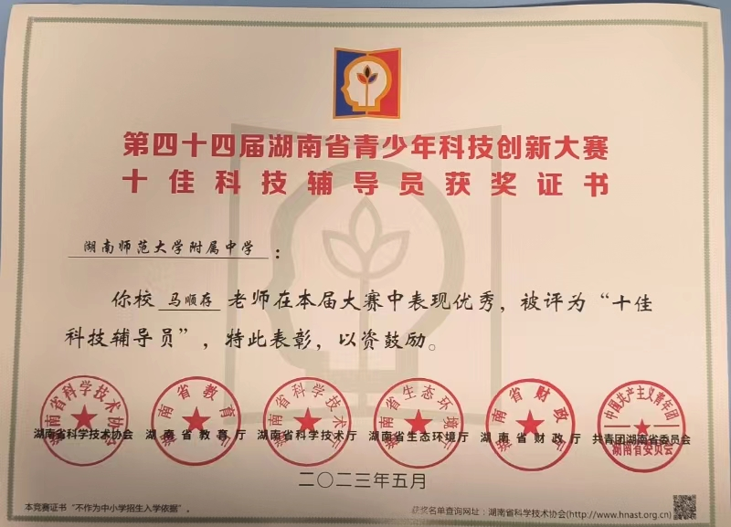 我校马顺存老师在第44届湖南省科技创新大赛中荣获“十佳科技创新辅导员”奖。