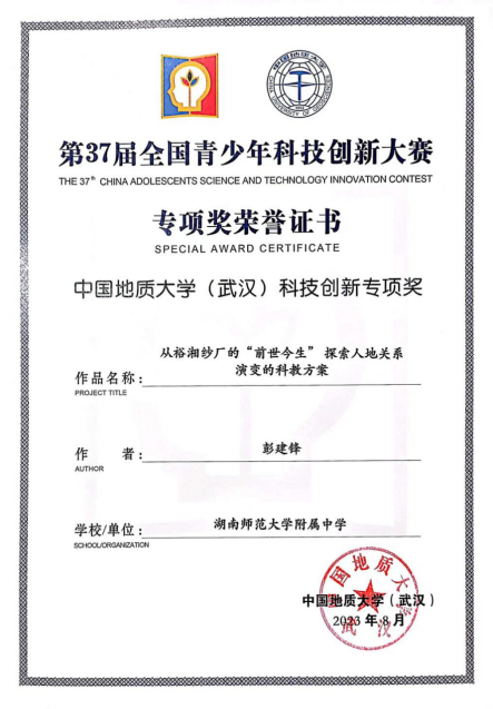 在第37届全国青少年科技创新大赛中,彭建峰老师表现突出,野外科学考察研究方案收到一致好评,在第37届全国青少年科技创新大赛荣获“中国地质大学科技创新专项奖”。