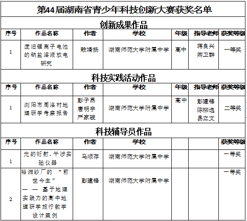 我校在第44届湖南省青少年科技创新大赛中3个项目获得一等奖,1个项目获二等奖,2项目进国赛。彭建锋老师、马顺存老师获科技辅导员作品省一等奖,高2209班学生赖靖扬获科技创新成果作品省一等奖,高2120、2212班彭子昂、唐明宇、严家骏获科技实践活动集体项目省二等奖。彭建锋老师与赖靖扬同学的作品分别被推荐参加第 37 届全国青少年科技创新大赛。