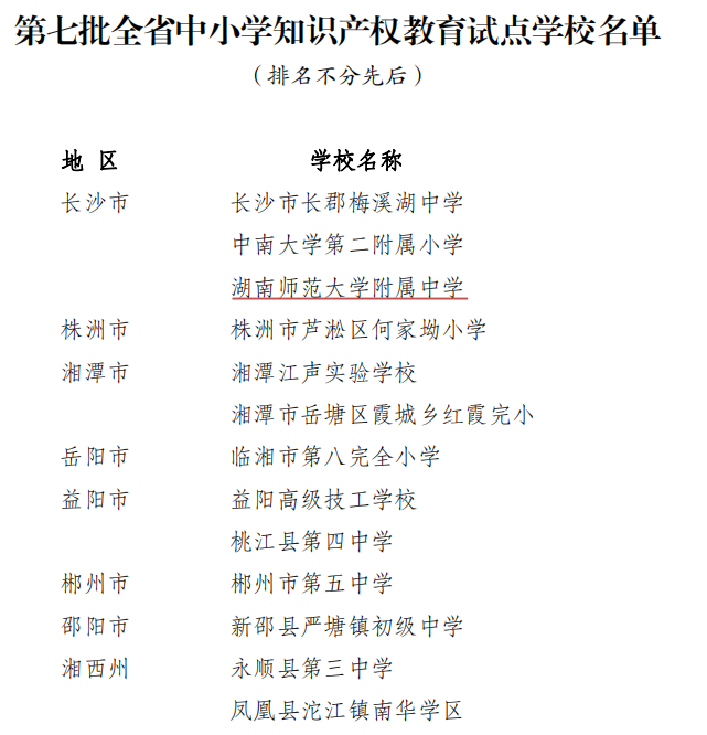 近日,湖南省知识产权局、湖南省教育厅联合发出通知,确定6所学校为第五批全省中小学知识产权教育示范学校,13所学校为第七批全省中小学知识产权教育试点学校。我校被评为湖南省中小学知识产权教育试点学校。