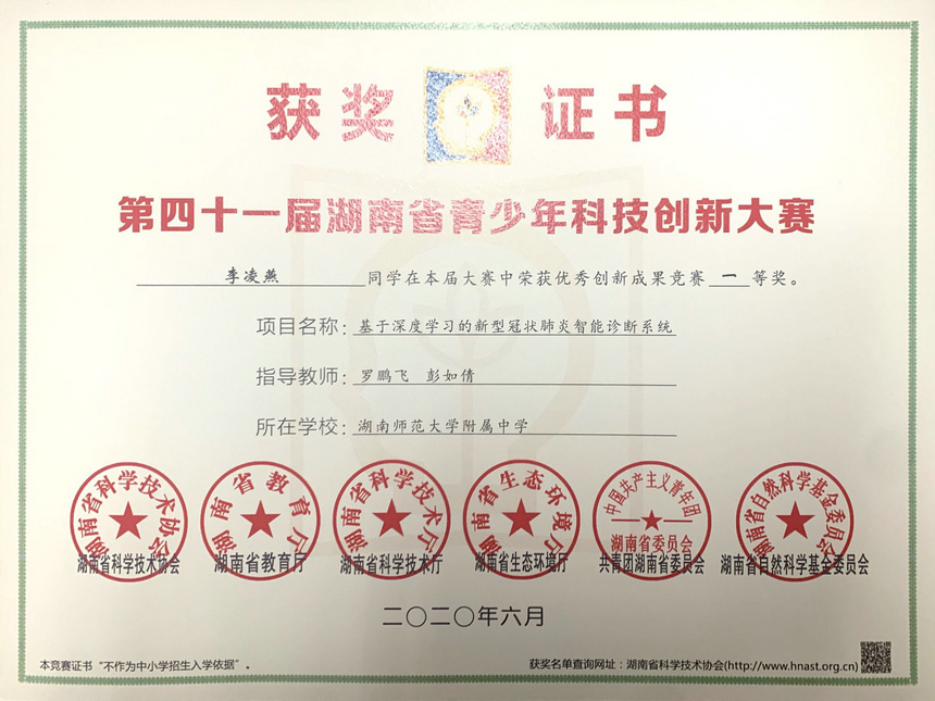 | 基于深度学习的新型冠状肺炎智 能诊断系统 | 李凌燕 | 罗鹏飞、彭如倩 | 论文及研究性学习一等奖 |