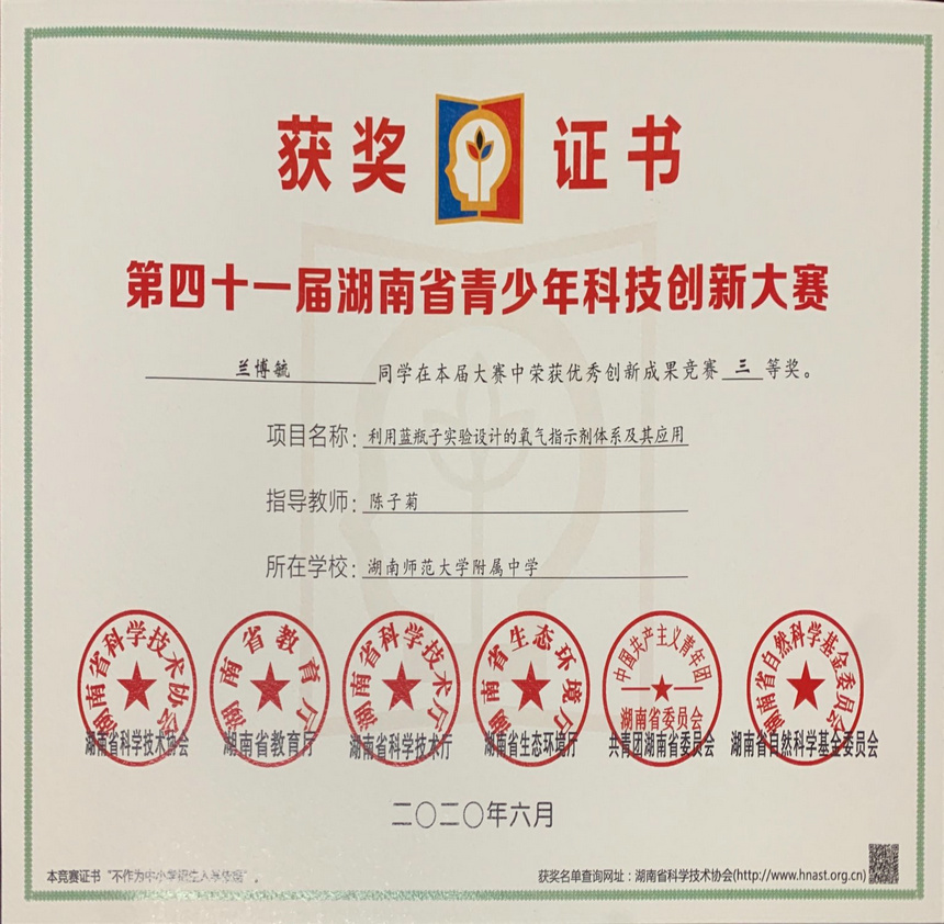 创新成果项目类三等奖:《利用蓝瓶子实验设计的氧气指示剂体系及其应用》,兰博毓同学创作,陈子菊老师指导。