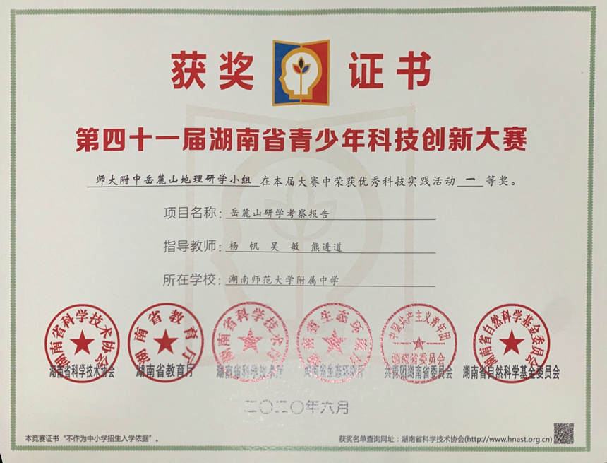 科技实践活动类一等奖:《岳麓山研学考察报告》,师大附中岳麓山地理研学小组创作,杨帆、吴敏、熊进道老师指导。