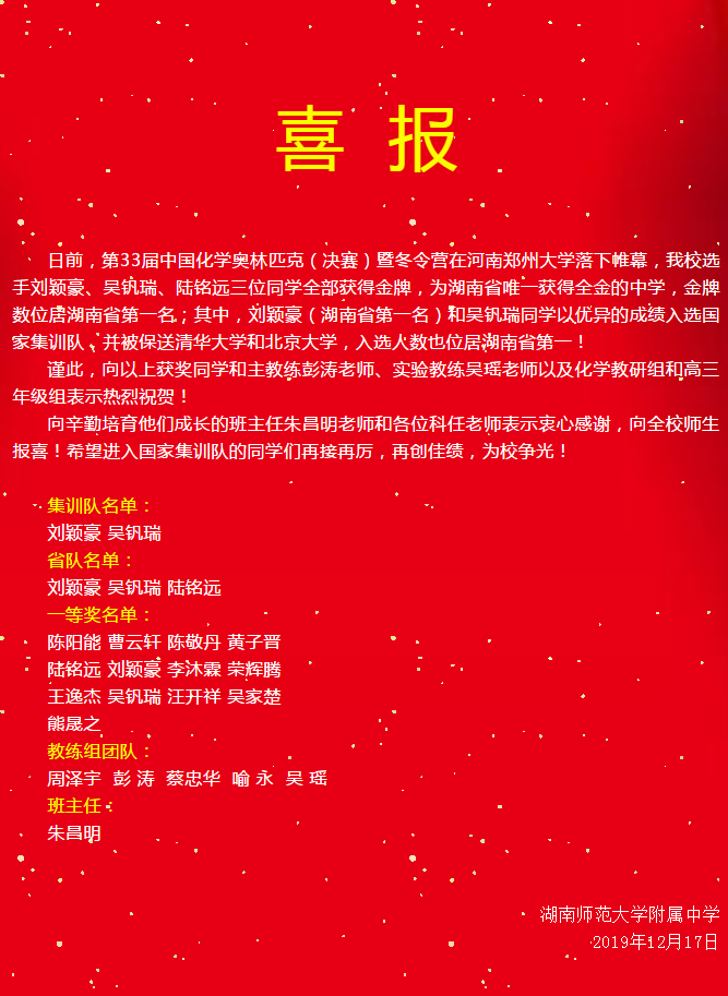 喜报:湖南师大附中刘颖豪、吴钒瑞两位同学入选化学奥赛国家集训队 来源:科技创新处 发布时间:2019-12-18 00:00:00 浏览次数: 次 【字体:小 大】 (从左至右)陆铭远、刘颖豪、吴钒瑞 点赞 收藏 在线帮助 分享到: 【打印正文】 相关内容