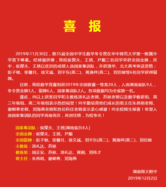 喜报:两人进集训队!3金6银!湖南师大附中数学奥赛各项数据全省第一 来源:科技创新处 发布时间:2019-12-04 00:00:00 浏览次数: 次 【字体:小 大】 点赞 收藏 分享到: 【打印正文】 相关内容