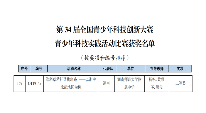 7月25日,由中国科协、教育部等九部门和澳门特区政府共同主办的第34届全国青少年科技创新大赛闭幕式在澳门大学综合体育馆隆重举行。我校刘文莉、谢佳妮、张蕾、周佳、唐铭同学共同创作的《给稻草秸秆寻找出路——以湘中北部地区为例》科技实践活动类作品,荣获科技实践活动类全国二等奖,指导教师:杨帆、黄雅芩、贺俊。