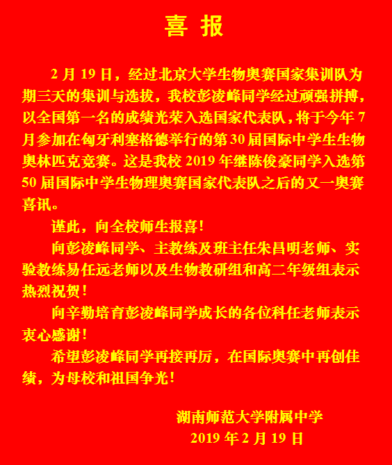 喜报:彭凌峰同学光荣入选生物奥赛国家代表队