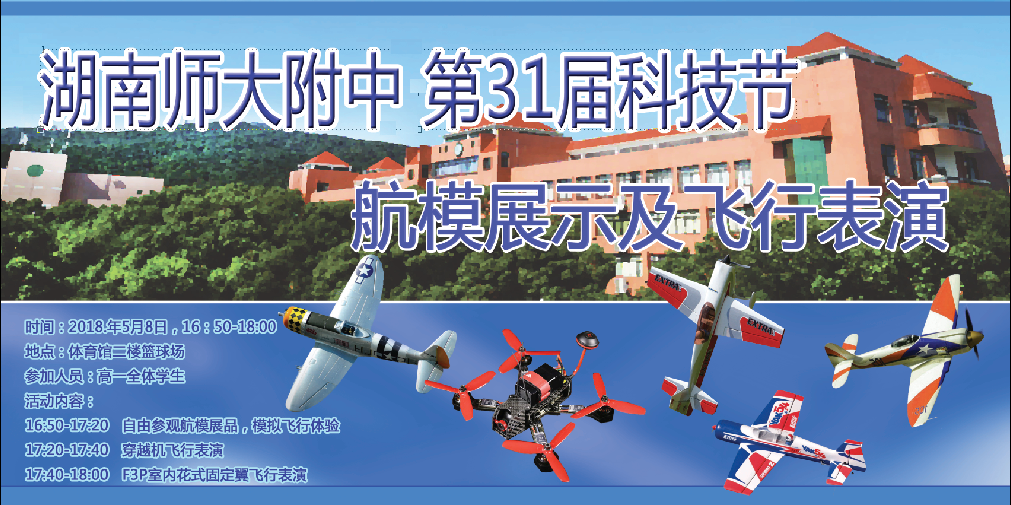 5月8日,第三十一届校园科技节活动之航模科普展示及飞行表演活动在我校隆重举行 ,校长助理、科技创新处主任蔡任湘,学生发展处副主任吴卿,团委书记李钊、物理教研组彭知文组长、马顺存老师以及科技创新处和学生发展处的老师出席了活动。高一年级班主任老师和学生们一起共享了由长沙市热心模友们带来的一场科普盛宴。