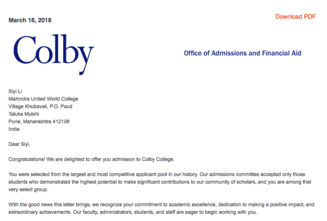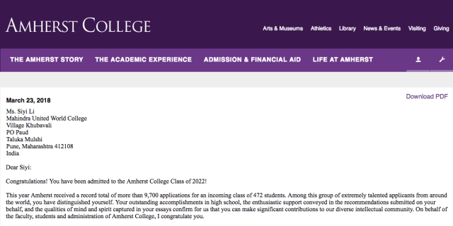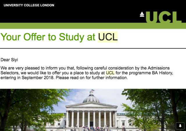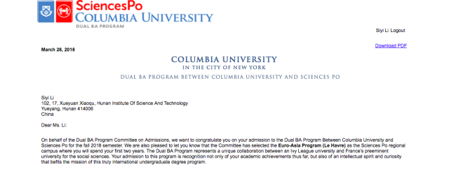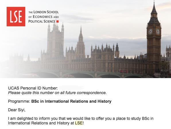 日前,我校李思颐同学同时收到了七所世界顶尖大学的录取通知书,三所来自英国:伦敦政治经济学院、伦敦大学学院、伦敦国王学院,均为英国顶级学府。四所来自美国并都获得了奖学金,耶鲁-新加坡国立大学学院给予140多万奖学金。阿姆赫斯特学院是美国最好的文理学院,入读她将获得每年53166美元,总值130多万人民币奖学金。另一所顶级文理学院科尔比学院,慷慨给出110万奖学金。哥伦比亚大学不吝示好,发放60万奖学金(其中在美国期间52万,合作学校巴黎政治学院两年1万欧元)。