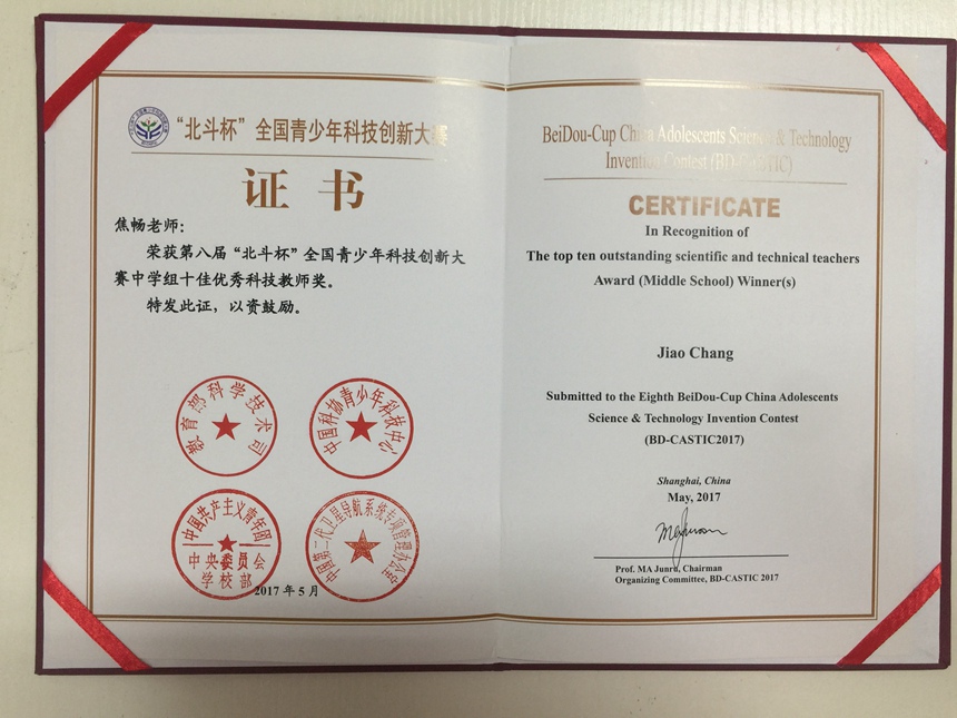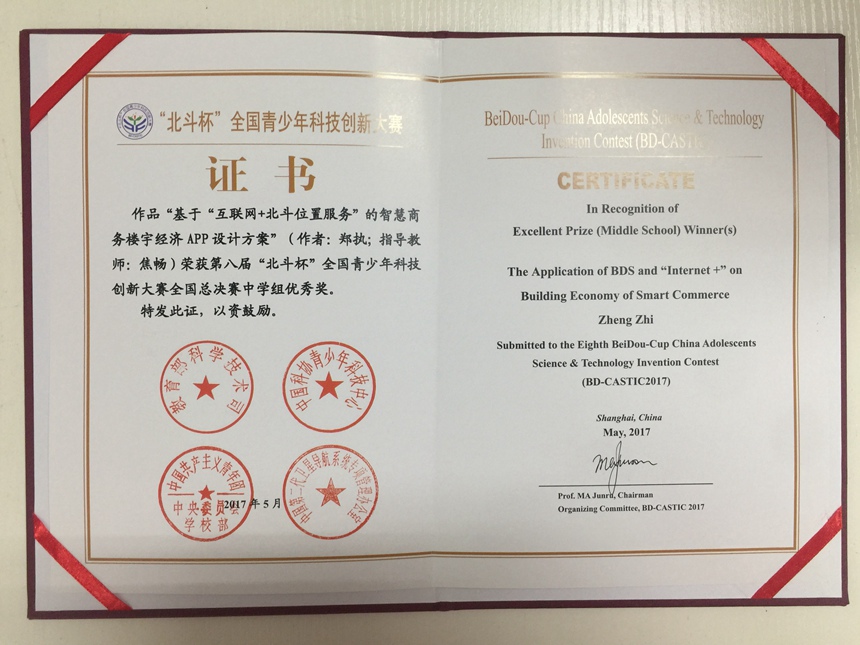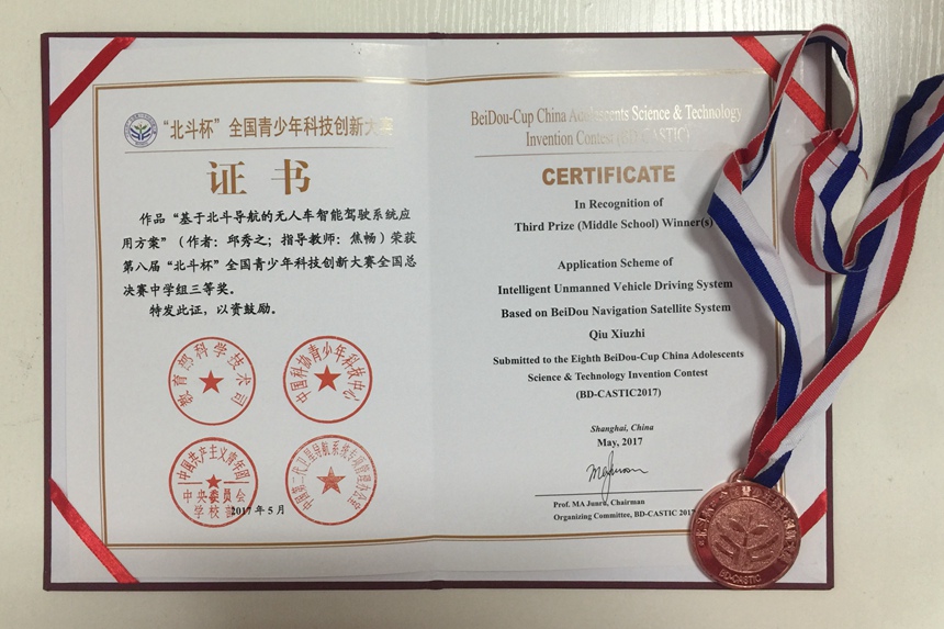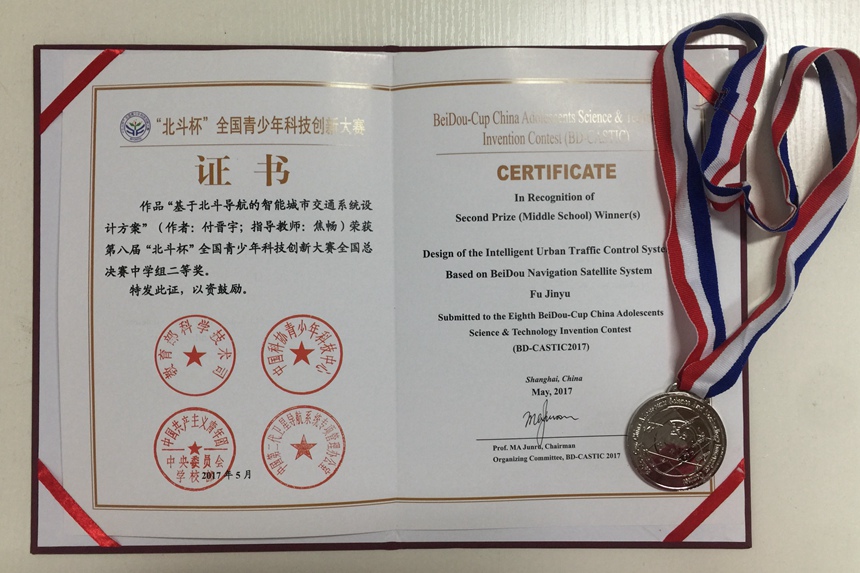 在中国卫星导航学术年会上,第八届北斗杯”全国青少年科技创新大赛(BD-CASTIC2017)总决赛结果揭晓,我校付晋宇同学的作品《基于北斗导航的智能城市交通系统设计方案》荣获中学组二等奖,指导老师李淑平、焦畅;邱秀之同学的作品《基于北斗导航的无人车智能驾驶系统应用方案》荣获中学组三等奖,指导老师焦畅;郑执同学的作品《基于“互联网+北斗位置服务”的智慧商务楼宇经济APP设计方案》荣获中学组优秀奖,指导老师焦畅;焦畅老师荣获第八届“北斗杯”全国青少年科技创新大赛全国总决赛中学组十佳优秀科技教师奖。