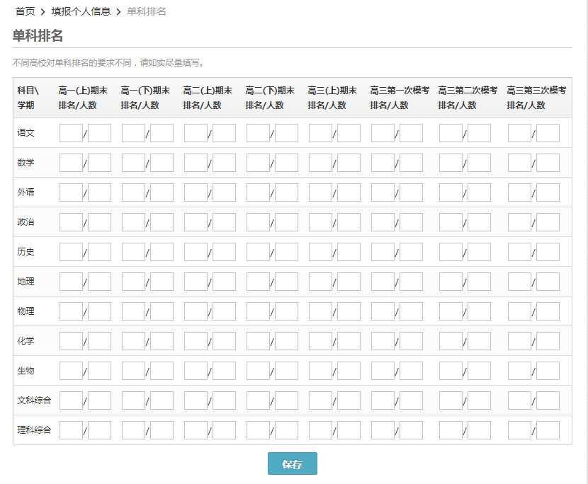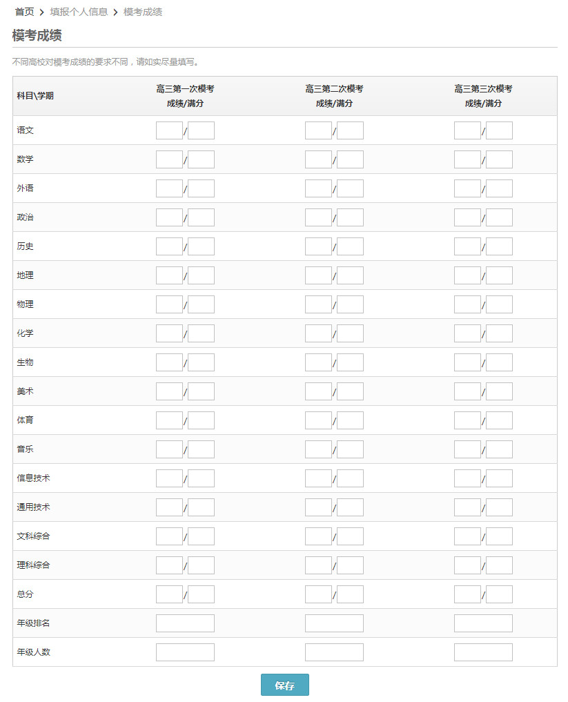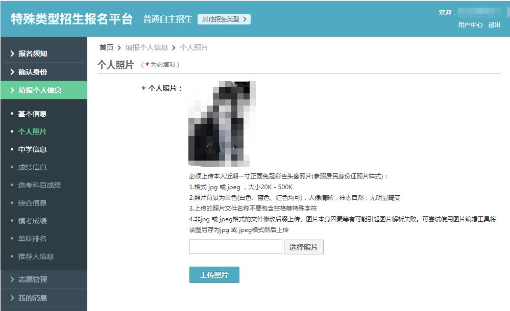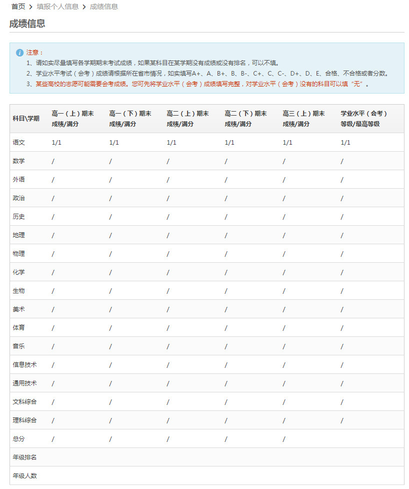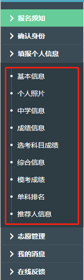 填写个人信息这个步骤包含:基本信息、个人照片、中学信息、成绩信息、学考科目成绩、综合信息、模考成绩、单科排名等内容。