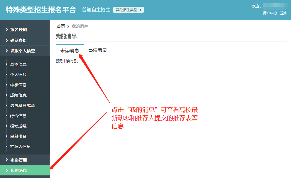 “我的消息”中,可以查看高校最新动态和推荐人提交的推荐表等信息。