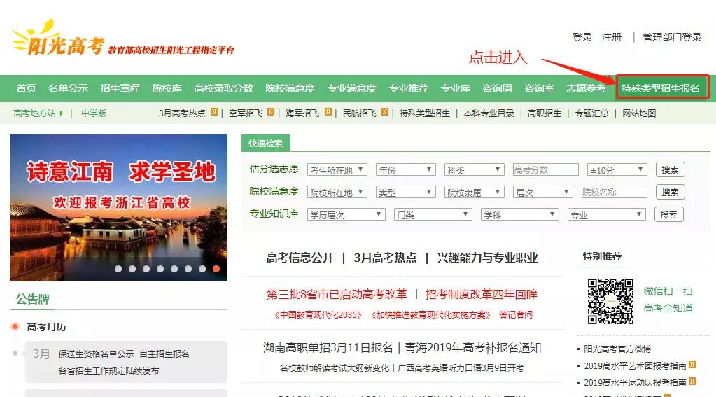 1.进入阳光高考网点击右上角“特殊类型招生报名”