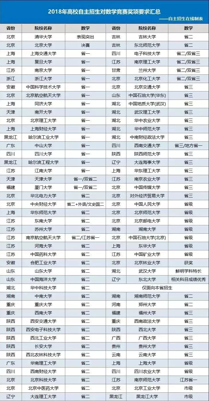 自主招生在线团队统计高校2018年自主招生对数学竞赛认可情况,供参考。各奖项等级考生可对照参考。