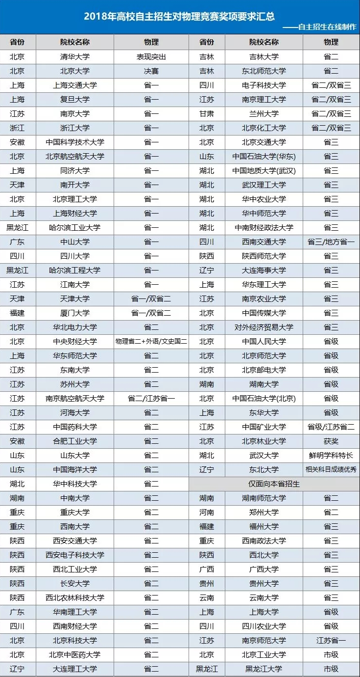 根据高校2018年自主招生简章统计对物理竞赛奖项等级要求情况,2019年请以当年招生简章要求为准。