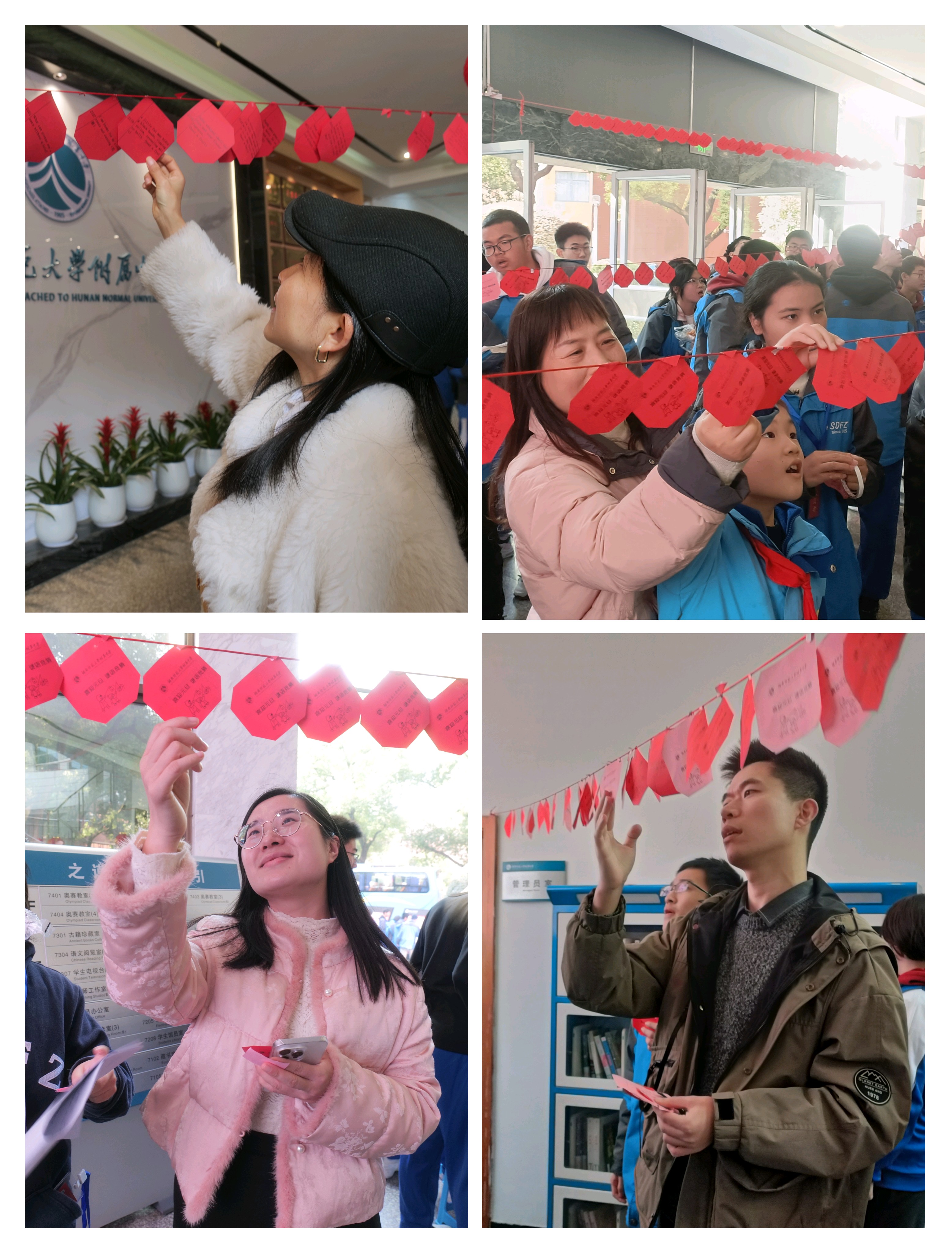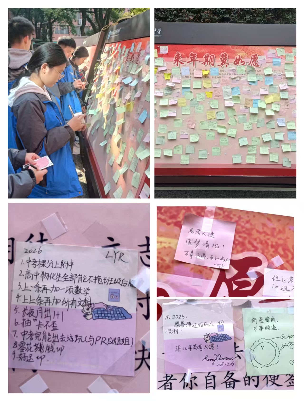 特别设置的“新年希冀”心愿展板成为另一处人气聚集地。同学们在彩色便利贴上认真书写新年愿望,一笔一划间流露着对未来的美好憧憬。集团校学生也积极参与其中,与附中学子一起分享青春梦想,展板上渐渐缀满五彩斑斓的便利贴,宛若一片承载希望的愿景之墙。“高考大捷,圆梦清北”,“2026年考上附中本部”,“中考裸分上附中”,“本学期的历史要考年级第一”,“愿善待过我的人,一切顺利”,一张张心愿卡片,承载着学子们的奋进之志——或是冲刺高考、圆梦名校的期许,或是深耕学业、勇夺佳绩的决心,更有对善待自己之人的美好祝愿。