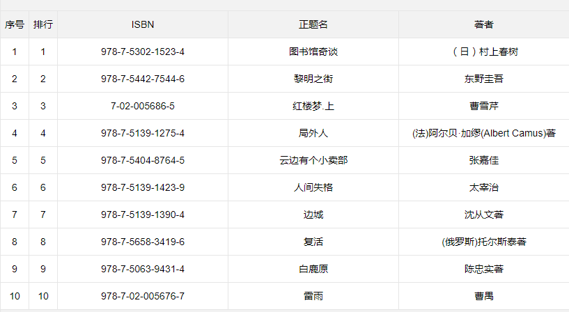 通过对借阅数据的统计分析发现,村上春树的《图书馆奇谈》位居年度借阅榜首,《红楼梦》《边城》等文学经典,《局外人》《罗生门》等外国名著也持续受到师生喜爱,反映出我校师生深厚的文学素养和开阔的阅读视野。