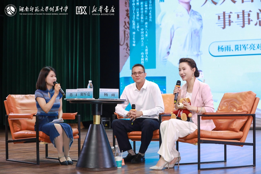 名家领读,启迪智慧。4月15日,学校承办长沙市中小学生读书行动“名家领读”第二期活动。本次活动特邀中南大学人文学院杨雨教授与物理学院阳军亮教授进行主题为“人人皆怀‘诗心’,事事总堪‘物语’”的跨学科对谈,为在场1000多师生带来一场思想盛宴。活动由肖莉老师主持,苏建祥副校长致辞。两位教授与现场师生深入互动,探讨文学与科学,学生代表献花致谢,全场合影留念,活动反响热烈。