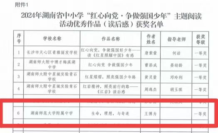 近日,湖南省教育厅中小学图书馆公布了“红心向党·争做强国少年”主题阅读活动评选结果,我校喜获多个奖项。由周语汐、唐捷妮、谢奥璠、刘浩屹、常静妮等多位同学共同制作的红色微电影《征途》荣获一等奖,王博为同学的《生命,理想,与奇迹》也斩获了读后感一等奖,胥阿罗同学的《百年寻梦,恰是风华正茂》和童仰城同学的《星火燎原终成势》分别获得了读后感的二等奖与三等奖。