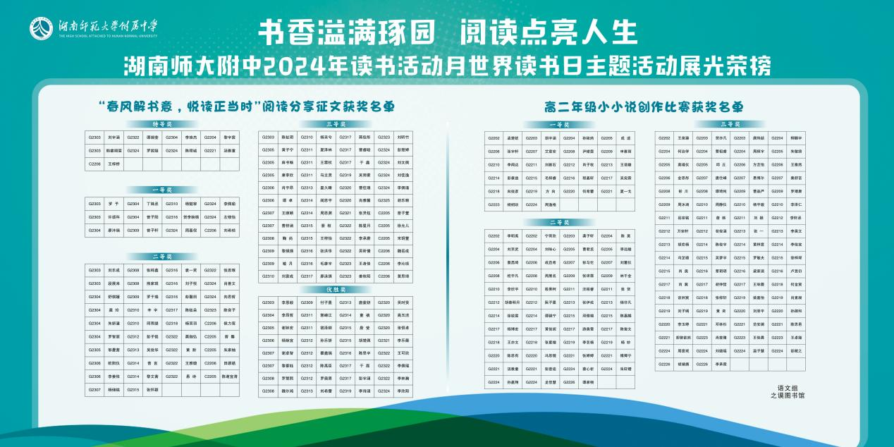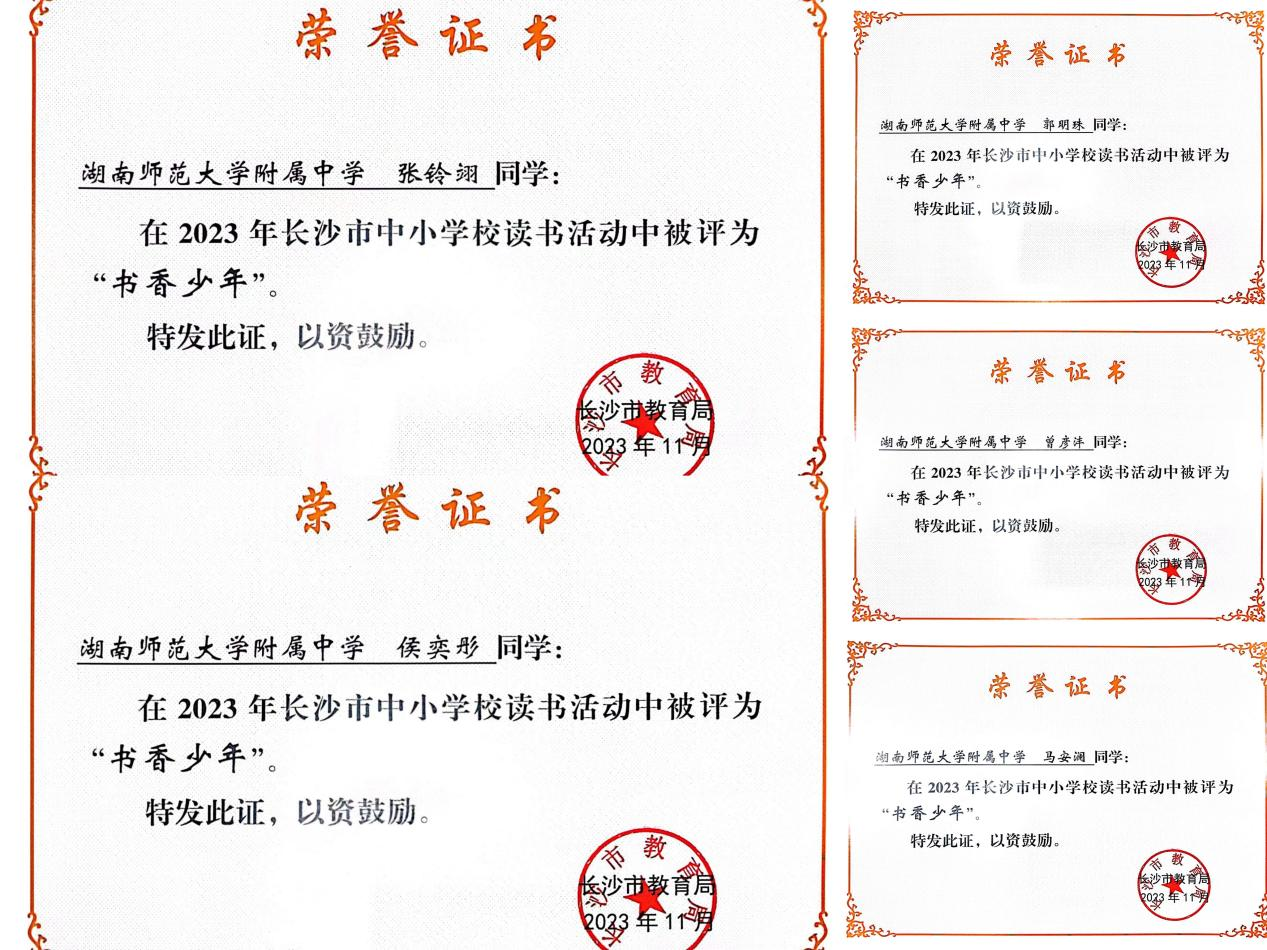 【长沙市教育局中小学校读书活动获奖】2023年12月,长沙市教育局公布了2023年长沙市中小学校读书活动评选结果,我校高2313班荣获“书香班级”称号,侯奕彤、曾彦沣、马安澜、郭明珠、张铃翊等五位同学荣获“书香少年”称号。