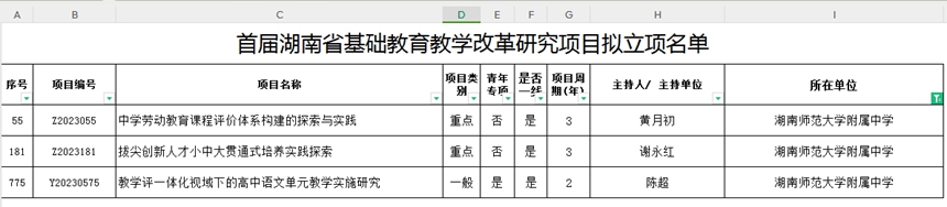 近日,湖南省教育厅下发《关于首届湖南省基础教育教学改革研究项目立项的通知》,我校三个项目入选。其中谢永红老师的项目《拔尖创新人才小中大贯通式培养实践探索》、黄月初老师的项目《中学劳动教育课程评价体系构建的探索与实践》获准立项为重点项目,陈超老师的项目《教学评一体化视域下的高中语文单元教学实施研究》获准立项为一般项目。