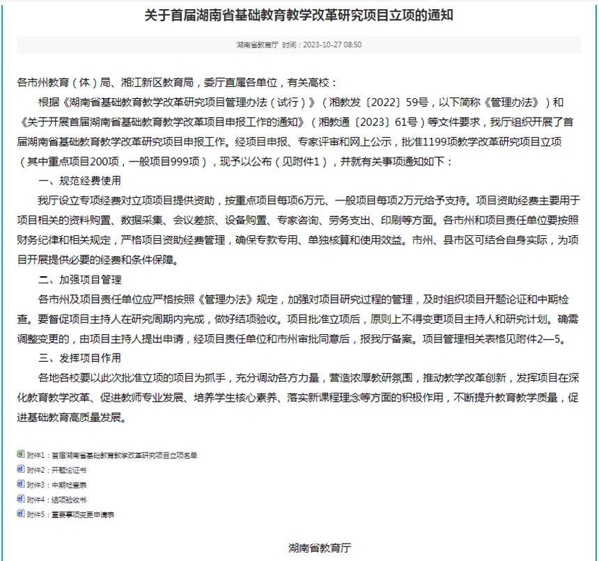 为加快推动基础教育教学改革,提高基础教育教学质量和办学水平,湖南省教育厅启动首届湖南省基础教育教学改革项目申报工作,旨在通过项目研究深化教育教学改革、促进教师专业发展、培养学生核心素养、落实新课程理念,不断提升教育教学质量,促进基础教育高质量发展。