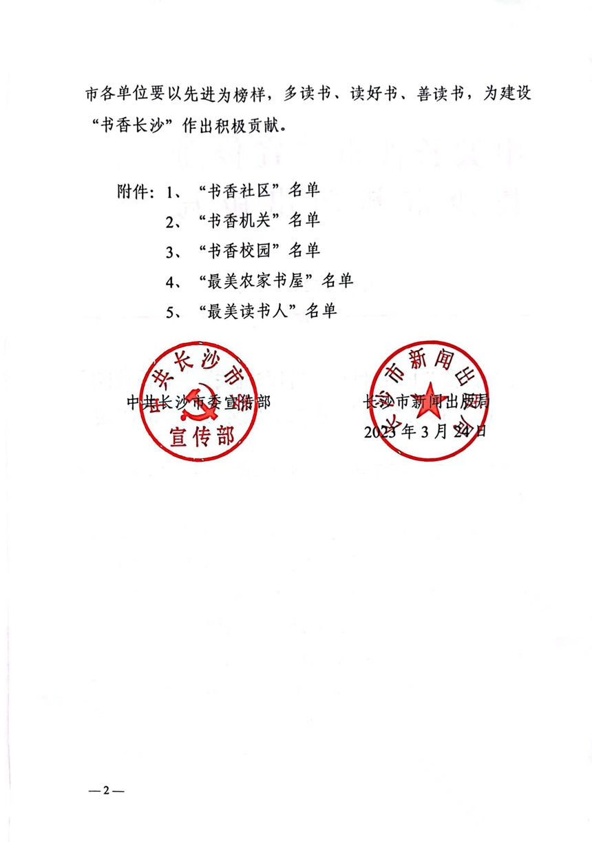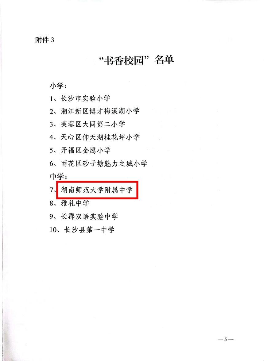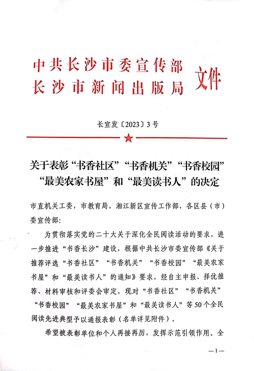 3月24日,中共长沙市委宣传部、长沙市新闻出版局联合公布了关于表彰“书香社区”“书香机关”“书香校园”“最美农家书屋”和“最美读书人”的决定。我校喜获“长沙书香校园”荣誉称号。