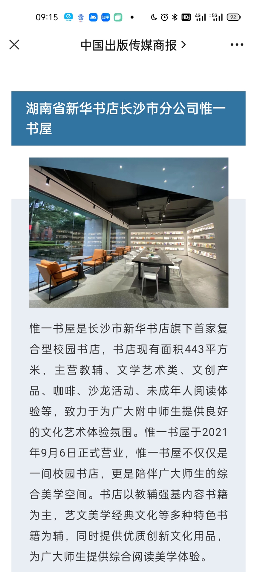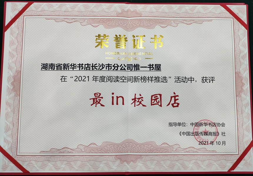 10月13日从浙江杭州传来喜讯,我校与湖南省新华书店长沙市分公司合作共建的惟一书屋,在中国新华书店协会和《中国出版传媒商报》社联合主办的“2021年度阅读空间新榜样”推选评比活动中,获得“最IN校园店”荣誉称号。