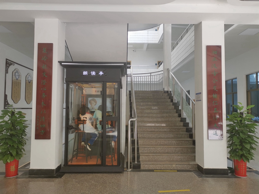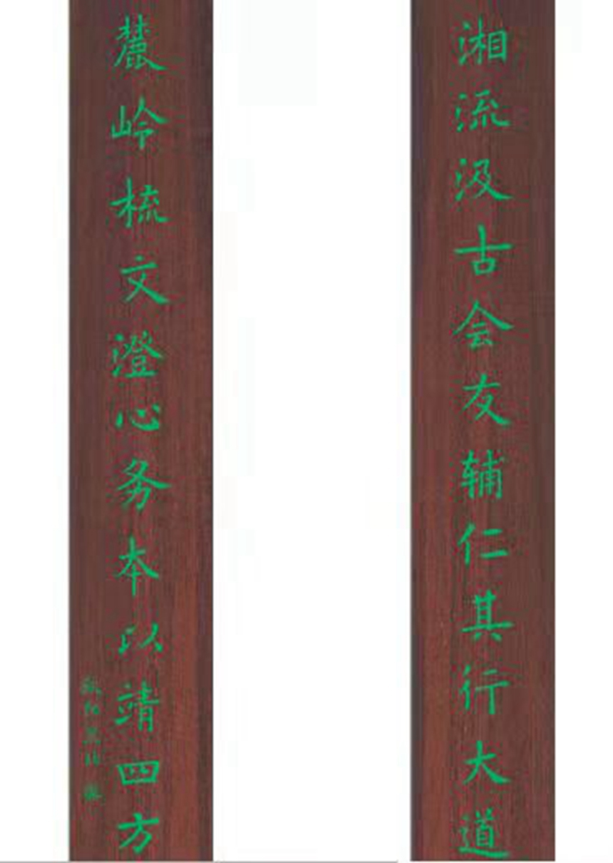 9月29日,之谟图书馆馆联制作并安装到位。馆联悬挂于之谟图书馆大厅楼梯口,联牌采用整幅实木板材制作,单幅宽340mm高2200mm,底板暗红,字色墨绿,字体为欧阳询楷体。馆联由特级教师欧阳昱北撰写,上联为“湘流汲古会友辅仁其行大道”,下联为“麓岭梳文澄心务本以靖四方”。